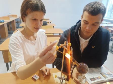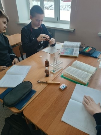 Ребята отрабатывали навыки обращения с химическим оборудованием и применяли полученные на уроке знания о типах химических реакций по признаку числа и состава исходных веществ и продуктов реакции.